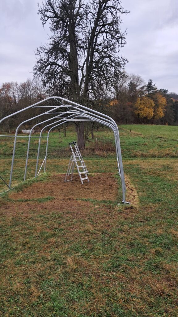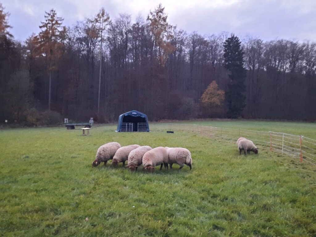 Dort angekommen, wurde sofort neugierig geschnuppert, geknabbert und geprüft, ob das Gras auch wirklich besser schmeckt als auf der alten Fläche. Das Weidezelt umzusetzen war der anstrengendere Teil – aber mit gemeinsamen Kräften und guter Laune haben wir es geschafft, es stabil an seinem neuen Platz zu verankern.